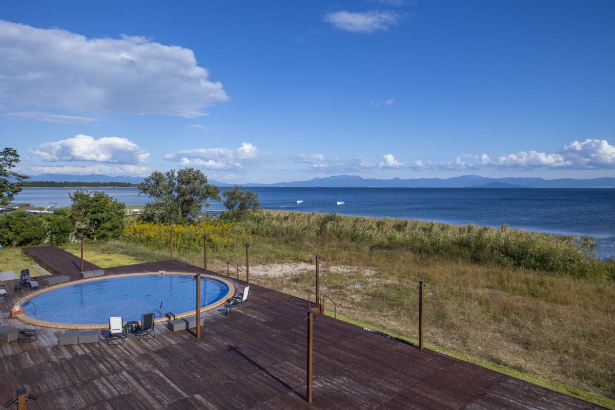 琵琶湖を一望できるテラススペースには、ナイトプールも楽しめる宿泊者限定のパブリックプール(直径約10m)をご用意しております。無料ですので、お気軽にお楽しみください。
