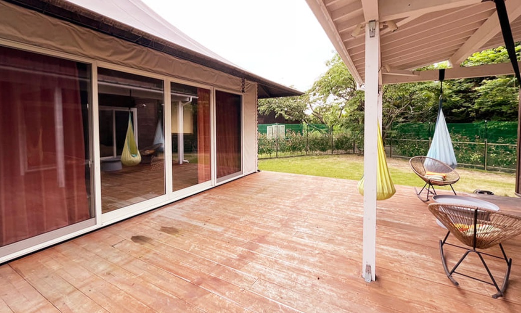 ワンちゃんをお連れのお客様はグランドーム滋賀高島の管理棟でもある「ドッググランピング滋賀高島」もおすすめです。全室プライベートドッグランを完備し、愛犬グッズも充実♪さらには保湿効果の高い天然温泉の貸切風呂もご利用いただけます。