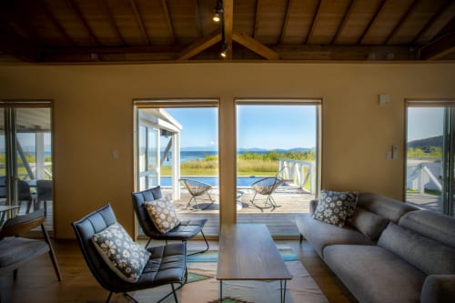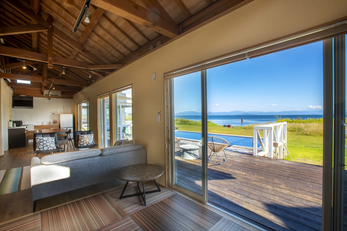 まさに琵琶湖の目の前にあるこのコテージは、なんと言っても大きな窓から琵琶湖の風景を眺められるのが魅力に。ソファーに座り、ティータイムを楽しみながら、時間とともに変わりゆく琵琶湖の表情を眺めているだけでも、優雅で贅沢な時間が過ごせるのではないでしょうか?